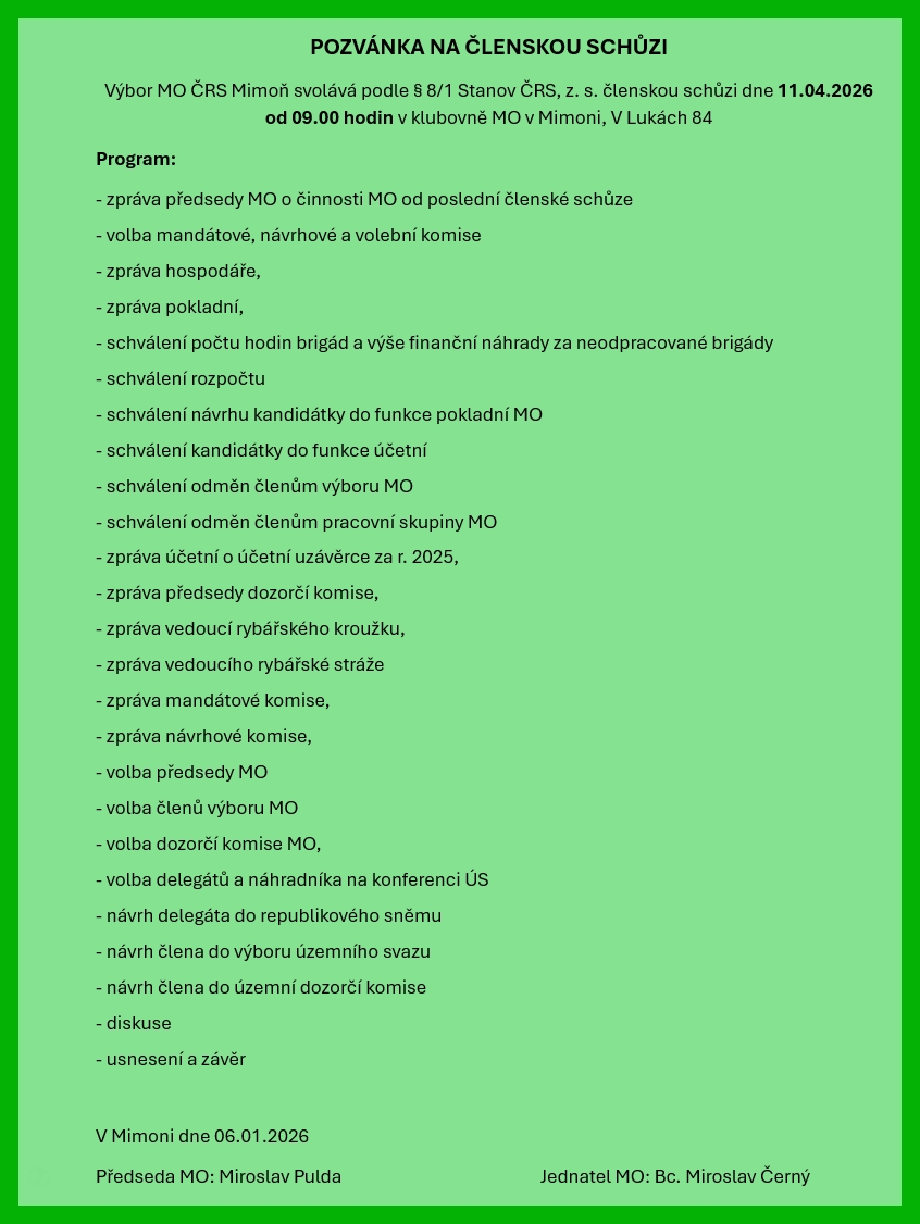 Pozvánka na členskou schůzi MO ČRS Mimoň - 11. 04. 2026 od 09:00 hodin