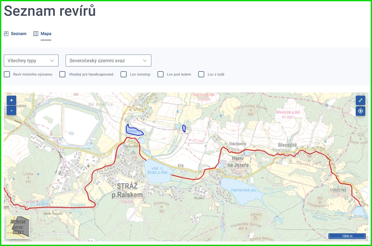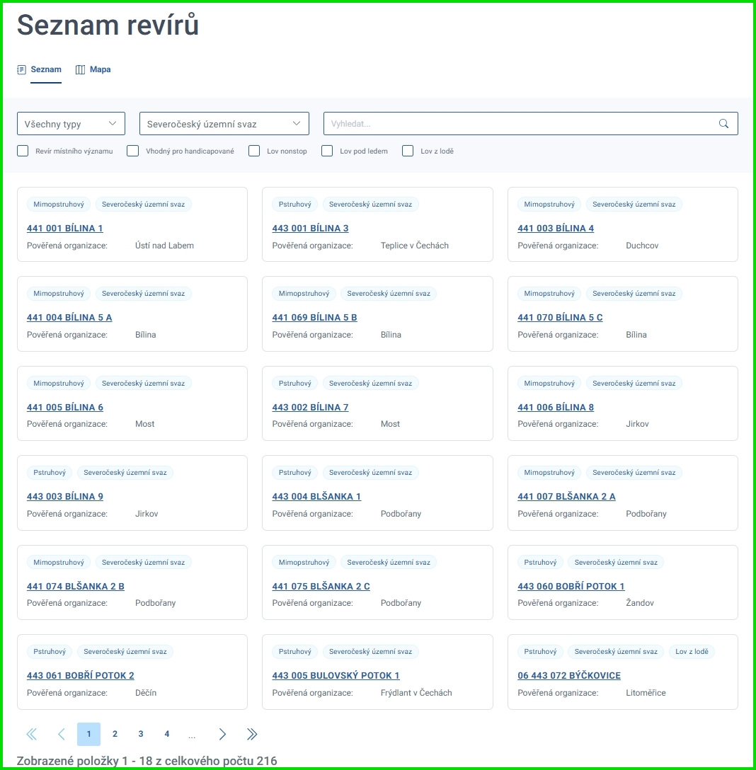 Na odkazu (POUŽITÍM TLAČÍTKA-Seznam revírů) pod tímto textem, se dostanete na stránky ČRS kde se vám zobrazí abecední seznam revírů (viz náhled dole). Můžete si přepnout na mapu a vyhledávat - otevřít si revír podle lokality v mapě (červeně jsou vyznačeny pstruhové, modře mimo-pstruhové, viz náhled dole). Pro vyhledávání v základním zobrazení si zvolíte typ revíru (všechny, pstruhový, mimo-pstruhový), dále si zvolíte z nabídky rybářský svaz a poté si můžete zadat různé filtry (lov z lodě, revíry místního významu, lov nonstop, atd.). Pokud znáte číslo revíru, můžete podle něj také revír vyhledat. Následně si otevřete konkrétní revír, který vás zajímá, pro získání podrobných informací (popis revíru, informace o podmínkách lovu konkrétního dne (ten si můžete v kalendáři nastavit), jsou zde stanovené míry ryb. Také si můžete otevřít statistiku ulovených ryb na daném revíru v konkrétních letech. Ve spodní části jsou kontakty na správce revíru a také mapa. Vše je velmi přehledné a uživatelsky přívětivé.